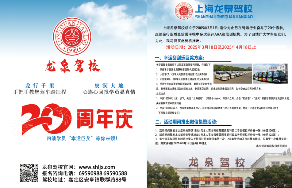 上海龙泉驾校成立于2005年3月,迄今为止已在驾培行业奋斗了20个春秋,连续在行业质量信誉考核中多次获评AAA级培训机构。为了回馈广大学车朋友们,为此,我司特在此契机推出: